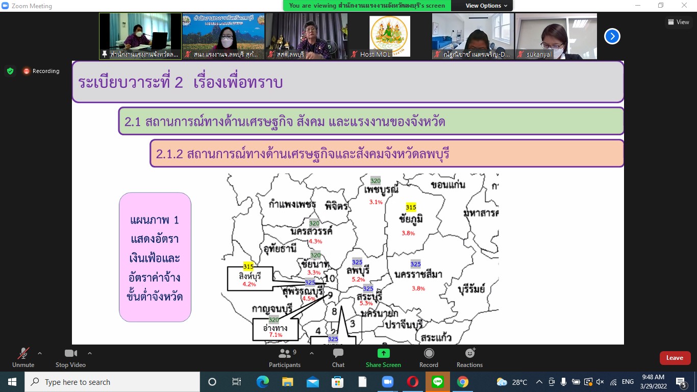 วันที่ 29 มีนาคม 2565 เวลา 09.30 น. นายนิวัฒน์ รุ่งสาคร ผู้ว่าราชการจังหวัดลพบุรี มอบหมาย สำนักงานแรงงานจังหวัดลพบุรีจัดประชุมกลุ่มย่อยเพื่อเตรียมความพร้อมก่อนพิจารณาทบทวนอัตราค่าจ้างขั้นต่ำของจังหวัดลพบุรี โดยมี นางสาวสุกัญญา องค์วิเศษไพบูลย์ แรงงานจังหวัดลพบุรี เป็นประธานฯ ซึ่งมีผู้แทนฝ่ายภาครัฐ ผู้แทนฝ่ายนายจ้าง และผู้แทนฝ่ายลูกจ้างในคณะอนุกรรมการพิจารณาอัตราค่าจ้างขั้นต่ำจังหวัดลพบุรี ฝ่ายละ 2 คน เข้าร่วมประชุมเพื่อรับทราบสถานการณ์ทางด้านเศรษฐกิจ สังคม และแรงงานของจังหวัดลพบุรี แผนการกำหนดอัตราค่าจ้างขั้นต่ำ ปี 2565 กรอบแนวทางและหลักเกณฑ์การทบทวนความเหมาะสมของอัตราค่าจ้างขั้นต่ำจังหวัดลพบุรี และความคิดเห็นเกี่ยวกับผลกระทบจากสถานการณ์โรคติดเชื้อไวรัสโคโรนา 2019 ต่ออัตราค่าจ้างขั้นต่ำของจังหวัดลพบุรี ผ่านระบบ Zoom Meeting ณ ห้องประชุมสำนักงานแรงงานจังหวัดลพบุรี ศาลากลางจังหวัดลพบุรี ชั้น 1 อำเภอเมืองลพบุรี จังหวัดลพบุรี