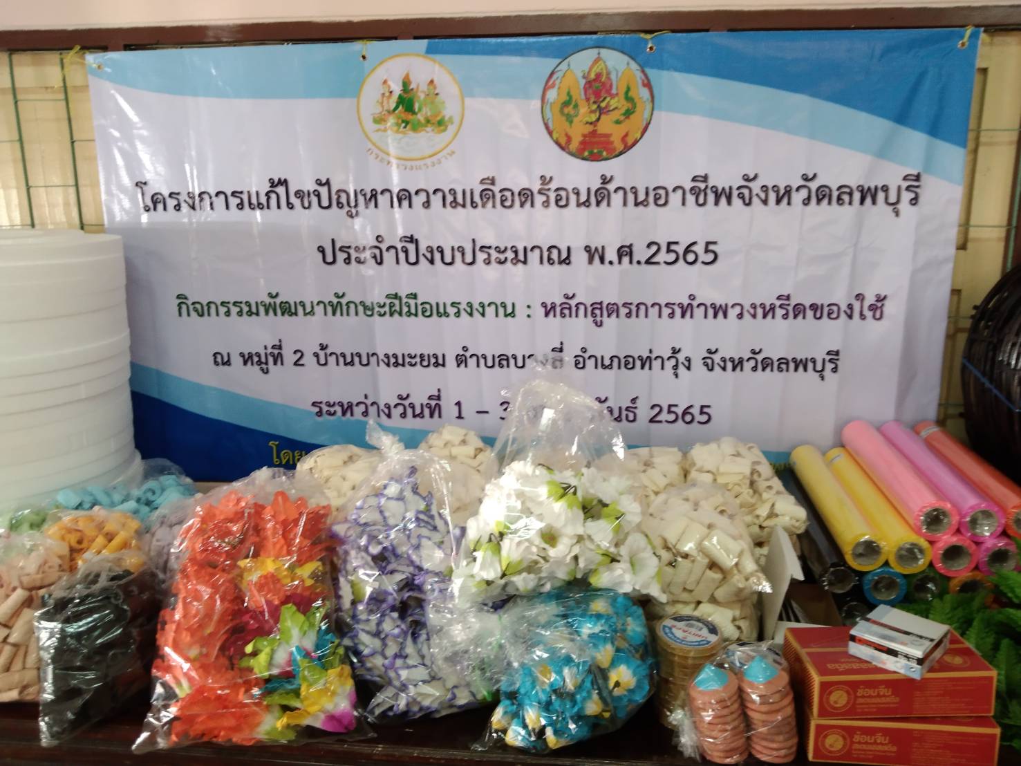วันที่ 1 กุมภาพันธ์ 2565 นางสาวสุกัญญา องค์วิเศษไพบูลย์ แรงงานจังหวัดลพบุรี มอบหมายให้นางสาวจิราภรณ์ อุปละ นักวิชาการแรงงานชำนาญการ และนางสาวรุ่งดารา ศรีจันทร์ดี นักวิชาการแรงงาน ลงพื้นที่เปิดกิจกรรมพัฒนาทักษะฝีมือแรงงาน ภายใต้โครงการแก้ไขปัญหาความเดือดร้อนด้านอาชีพจังหวัดลพบุรี ประจำปีงบประมาณ พ.ศ.2565 ในพื้นที่อำเภอท่าวุ้ง จังหวัดลพบุรี จำนวน 2 กิจกรรม 1) หลักสูตรการทำพวงหรีดของใช้ ณ หมู่ที่ 2 บ้านบางมะยม ตำบลบางลี่ มีผู้เข้าร่วมกิจกรรม จำนวน 20 คน และ 2) หลักสูตรการทำผลิตภัณฑ์จากไม้ไผ่ ณ หมู่ที่ 3 บ้านไทรย้อย ตำบลบางคู้ มีผู้เข้าร่วมกิจกรรม จำนวน 20 คน ซึ่งดำเนินกิจกรรมระหว่าง วันที่ 1 กุมภาพันธ์ – 3 กุมภาพันธ์ 2565 เป็นระยะเวลา 3 วัน โดยมีวัตถุประสงค์เพื่อช่วยเหลือประชาชน หรือผู้ใช้แรงงานที่ประสบปัญหาความเดือดร้อนด้านอาชีพ ให้มีโอกาสในการเพิ่มพูนศักยภาพในทักษะใหม่ ๆ นอกเหนือจากทักษะเดิมที่มีอยู่เพื่อนำไปสู่การพัฒนาตนเองอย่างต่อเนื่องมีรายได้เพิ่มจากทักษะความรู้ใหม่ที่ได้รับจากการฝึกอบรมและส่งเสริมการมีส่วนร่วมของประชาชนในพื้นที่ในรูปแบบประชารัฐ พร้อมนี้ มีผู้แทนสำนักงานสวัสดิการและคุ้มครองแรงงานจังหวัดลพบุรี ร่วมให้ความรู้เรื่องสิทธิประโยชน์ของแรงงานนอกระบบในการนี้ด้วย
