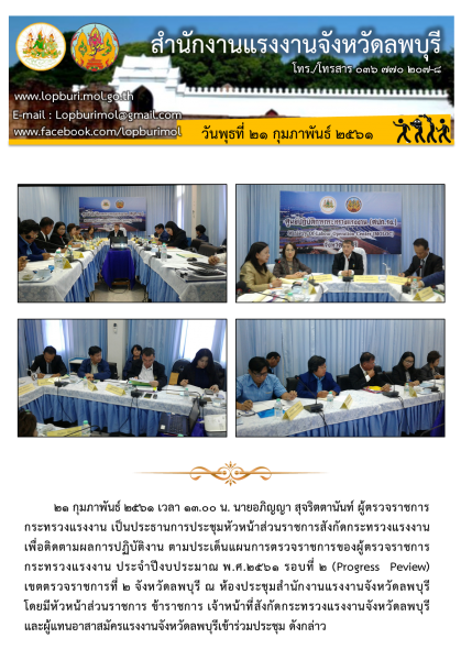 วันที่ 21 กุมภาพันธ์ 2561 เวลา 13.00 น. นายอภิญญา สุจริตตานันท์ ผู้ตรวจราชการกระทรวงแรงงาน เป็นประธานการประชุมหัวหน้า่สวนราชการสังกัดกระทรวงแรงงาน เพื่อติดตามผลการปฏิบัติงาน ตามประเด็นแผนการตรวจราชการของผู้ตรวจราชการกระทรวงแรงงาน ประจำปีงบประมาณ พ.ศ.2561 รอบที่ 2 (Progress Peview) เขตตรวจราชการที่ 2 จังหวัดลพบุรี ณ ห้องประชุมสำนักงานแรงงานจังหวัดลพบุรี โดยมีส่วนราชการ ข้าราชการ เจ้าหน้าที่สังกัดกระทรวงแรงงานจังหวัดลพบุรี และผู้แทนอาสาสมัครแรงงานจังหวัดลพบุรีเข้าร่วมประชุมดังกล่าว