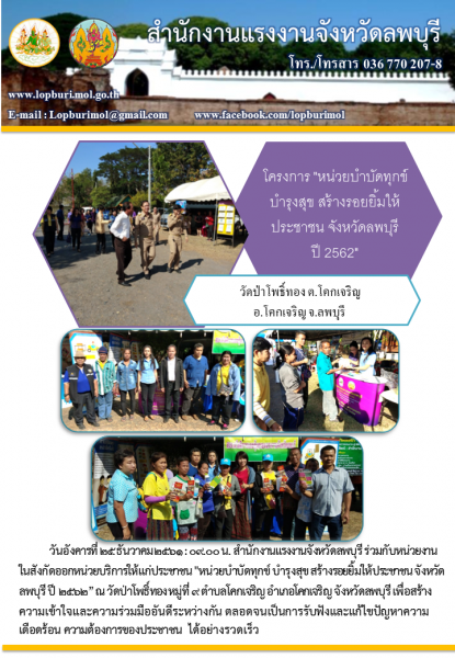 สำนักงานแรงงานจังหวัดลพบุรี ร่วมออกหน่วยบริการประชาชนโครงการบำบัดทุกข์ บำรุงสุข สร้างรอยยิ้มให้กับประชาชน