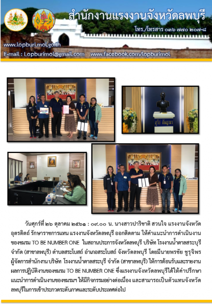 สำนักงานแรงงานจังหวัดลพบุรี ออกติดตาม ให้คำแนะนำการดำเนินงานของชม TO BE NUMBER ONE บริษัท โรงงานน้ำตาล สระบุรี จำกัด (สาขาลพบุรี)