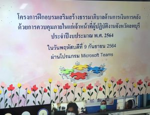 วันที่ 9 กันยายน 2564 เวลา 09.00 น. นางสาวสุกัญญา องค์วิเศษไพบูลย์ แรงงานจังหวัดลพบุรี มอบหมายให้ นางปทุมมาตย์ สมมัง เจ้าพนักงานการเงินและบัญชีชำนาญงาน พร้อมด้วยเจ้าหน้าที่สำนักงานแรงงานจังหวัดลพบุรี เข้าร่วมประชุมการฝึกอบรมเสริมสร้างธรรมาภิบาลด้านการเงินการคลังด้วยการควบคุมภายในให้แก่เจ้าหน้าที่ผู้ปฏิบัติงานจังหวัดลพบุรี ประจำปีงบประมาณ พ.ศ. 2564 โดยมีนางไตรทิพย์ พุ่มศิลา คลังจังหวัดลพบุรี เป็นประธานการประชุม ณ สำนักงานแรงงานจังหวัดลพบุรี ศาลากลางจังหวัดลพบุรี ชั้น 1 อำเภอเมืองลพบุรี จังหวัดลพบุรี ผ่านโปรแกรม Microsoft Team