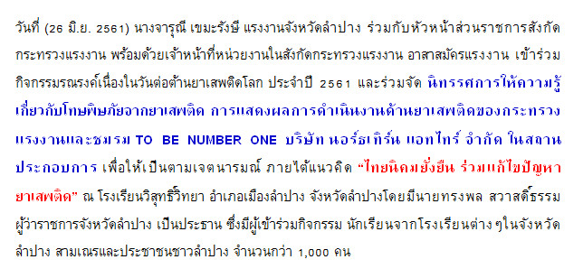 สำนักงานแรงงานจังหวัดลำปางและหน่วยงานสังกัดกระทรวงแรงงานงานร่วมกิจกรรมเนื่องในวันยาเสพติดโลก ปี 2561 ภายใต้แนวคิดและคำขวัญ “ไทยนิยม ยั่งยืน ร่วมแก้ไขปัญหายาเสพติด”