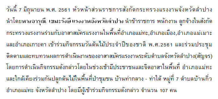 สำนักงานแรงงานจังหวัดลำปาง ดำเนินโครงการกิจกรรมวันต้นไม้ประจำปีของชาติ พ.ศ.2561 และร่วมประชุมติดตามและทบทวนผลการดำเนินงานของอาสาสมัครแรงงานระดับตำบลจังหวัดลำปาง(สัญจร)