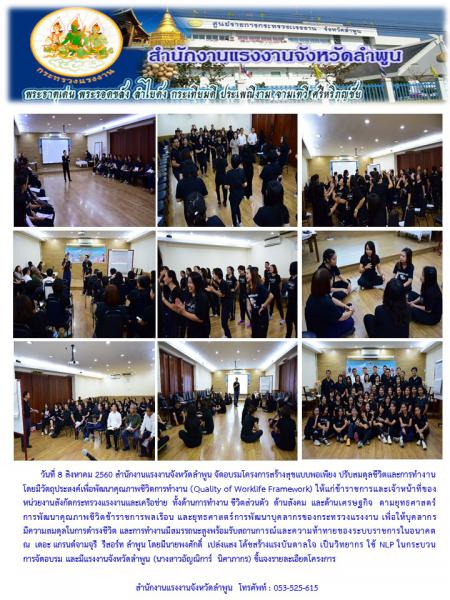 สำนักงานแรงงานจังหวัดลำพูน จัดอบรมโครงการสร้างสุขแบบพอเพียง ปรับสมดุลชีวิตและการทำงาน โดยมีวัตถุประสงค์เพื่อพัฒนาคุณภาพชีวิตการทำงาน (Quality of Worklife Framework) ให้แก่ข้าราชการและเจ้าหน้าที่ของหน่วยงานสังกัดกระทรวงแรงงานและเครือข่าย