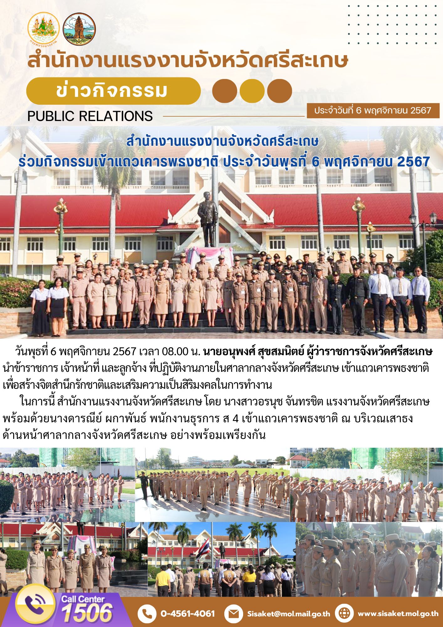 วันพุธที่ 6 พฤศจิกายน 2567 เวลา 08.00 น. นายอนุพงศ์ สุขสมนิตย์ ผู้ว่าราชการจังหวัดศรีสะเกษ
