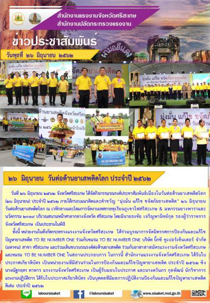 สำนักงานแรงงานจังหวัดศรีสะเกษ ร่วมรณรงค์ประชาสัมพันธ์เนื่องใน วันต่อต้านยาเสพติดโลก (26 มิถุนายน) ประจำปี 2562 ภายใต้กรอบแนวคิดและคำขวัญ “มุ่งมั่น แก้ไข ขจัดภัยยาเสพติด”