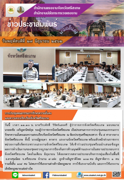 สำนักงานแรงงานจังหวัดศรีสะเกษ เข้าร่วมการประชุมคณะกรรมการรักษาความมั่นคงและความสงบเรียบร้อยจังหวัดศรีสะเกษ