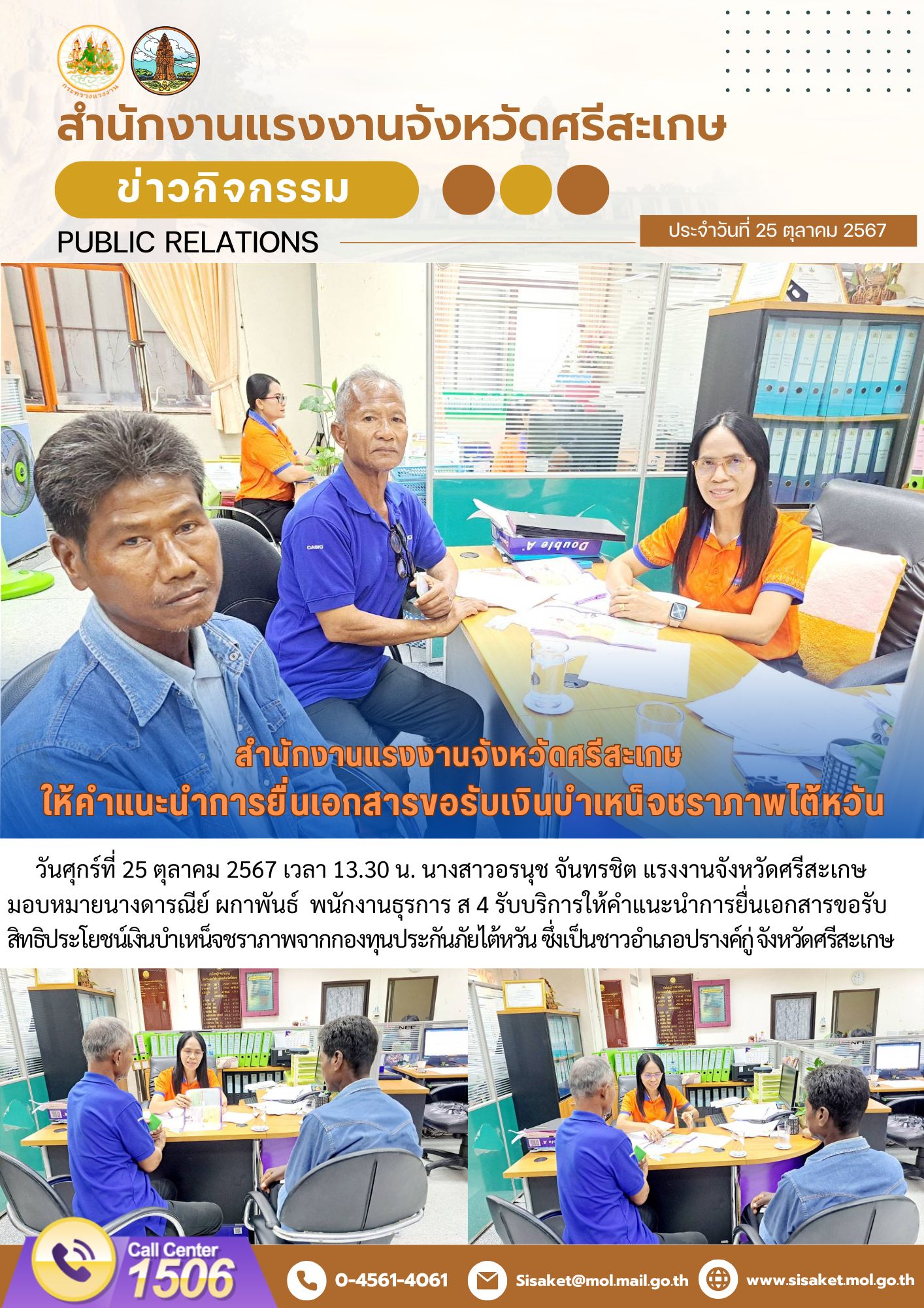 วันศุกร์ที่ 25 ตุลาคม 2567 เวลา 13.30 น. นางสาวอรนุช จันทรชิต แรงงานจังหวัดศรีสะเกษ