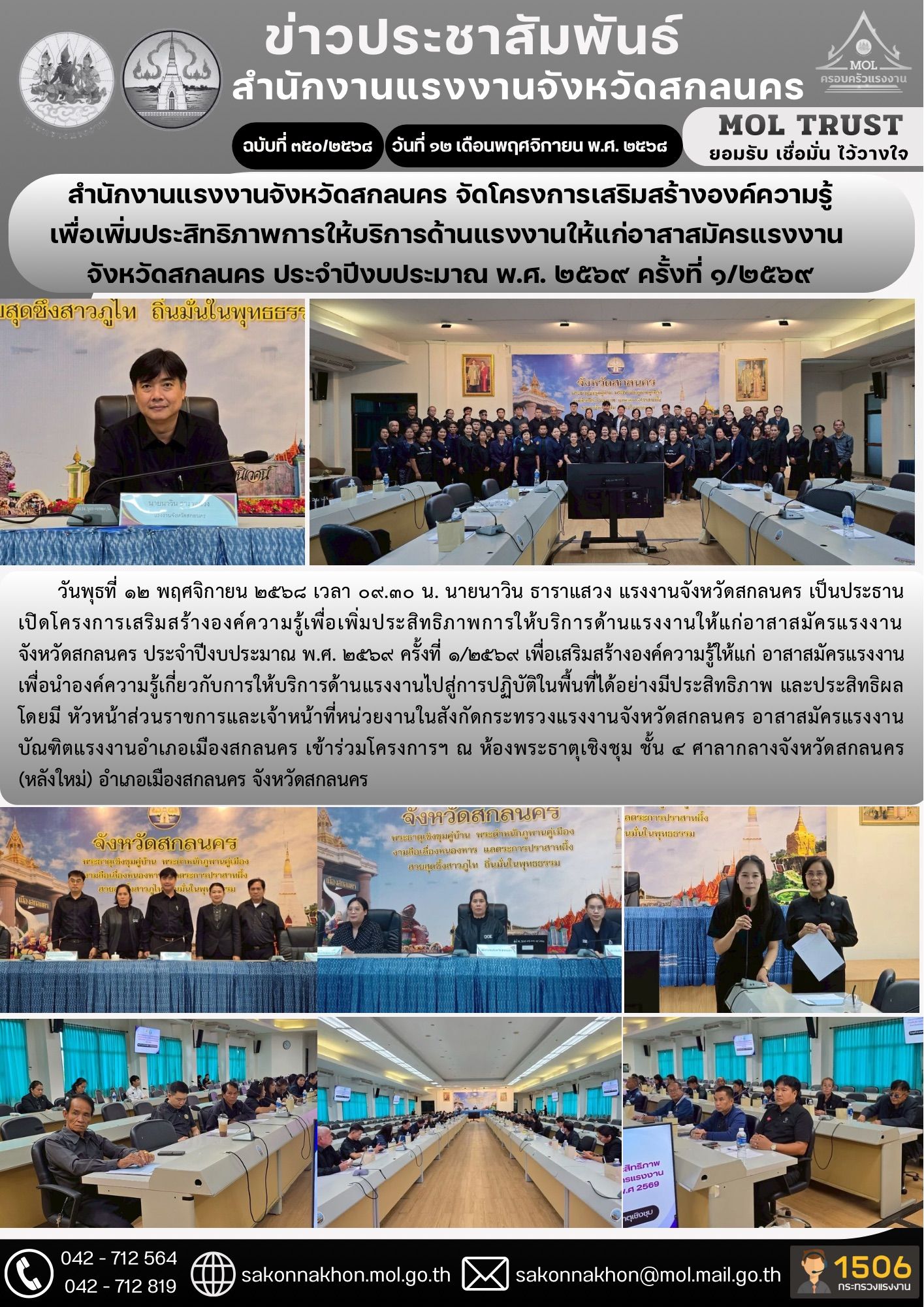 สำนักงานแรงงานจังหวัดสกลนคร จัดโครงการเสริมสร้างองค์ความรู้ เพื่อเพิ่มประสิทธิภาพการให้บริการด้านแรงงานให้แก่อาสาสมัครแรงงานจังหวัดสกลนคร ประจำปีงบประมาณ พ.ศ. 2569 ครั้งที่ 1/2569