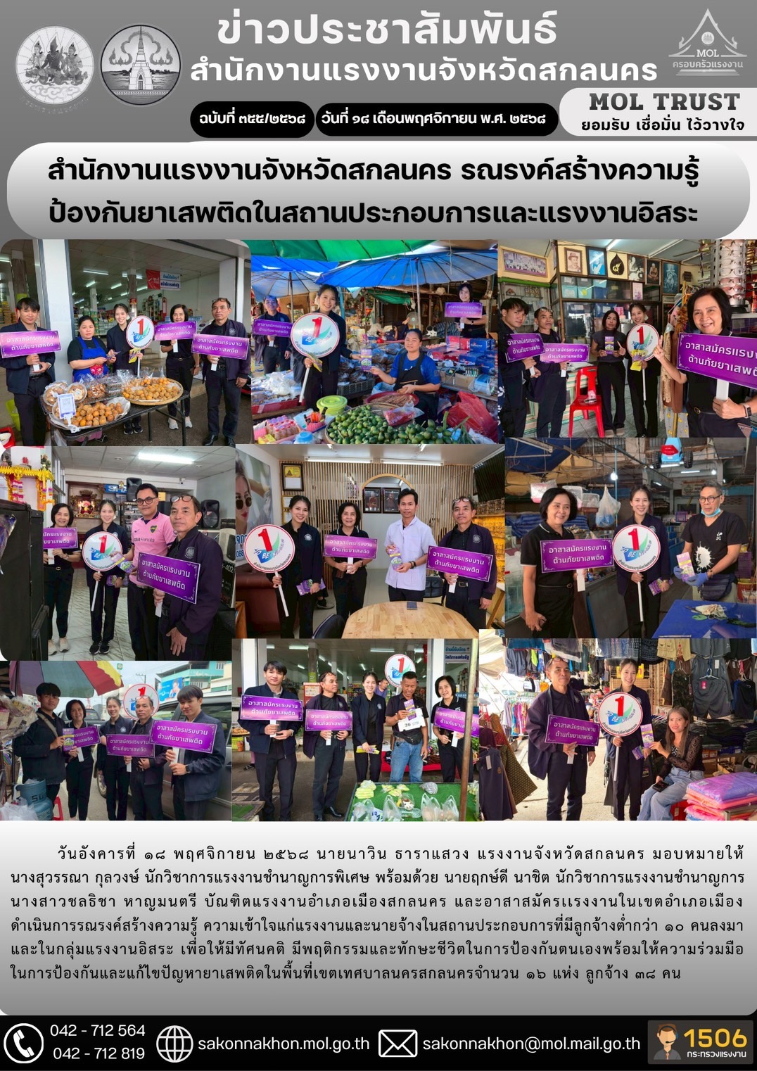 สำนักงานแรงงานจังหวัดสกลนคร รณรงค์สร้างความรู้ป้องกันยาเสพติดในสถานประกอบการและแรงงานอิสระ