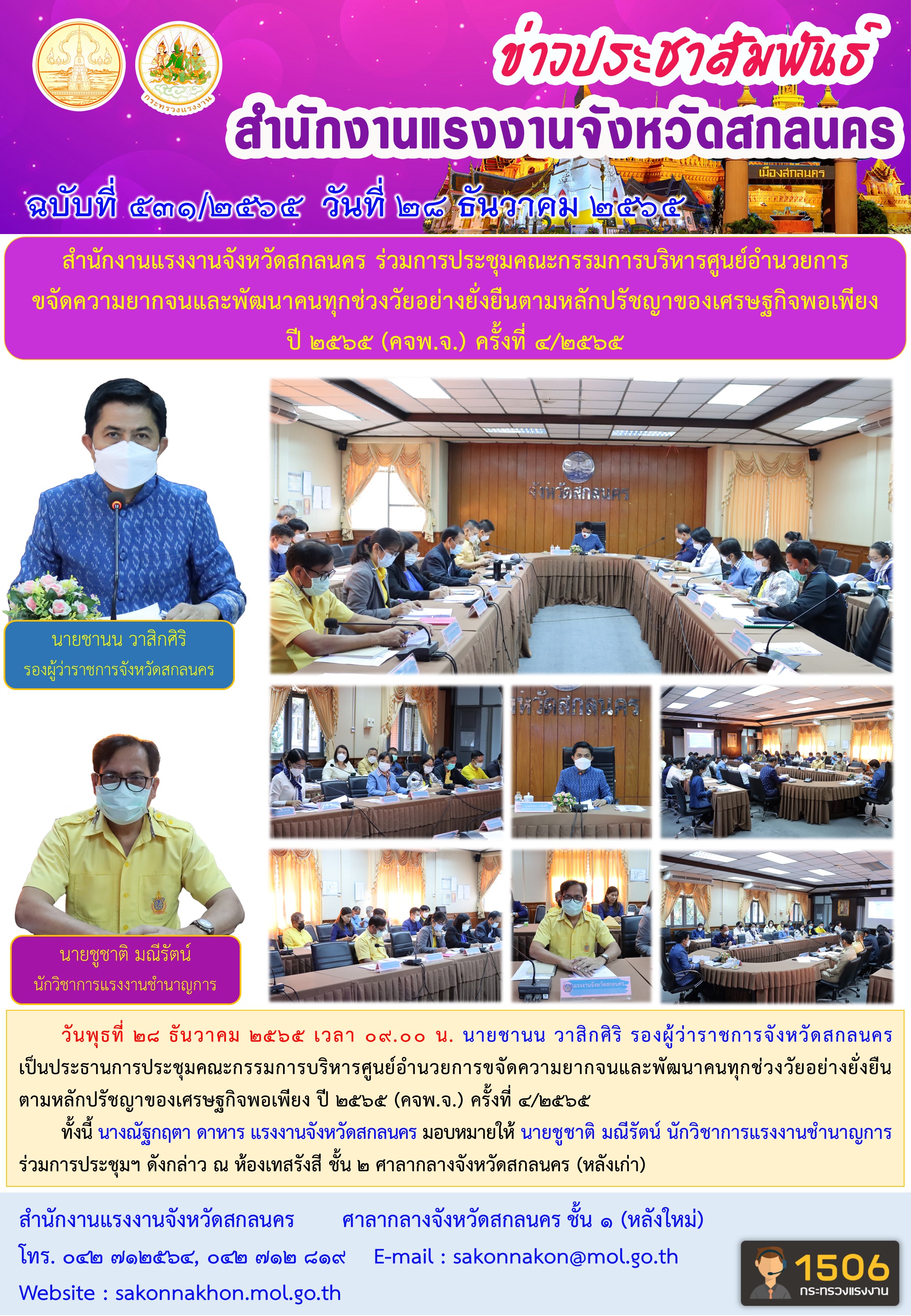 สำนักงานแรงงานจังหวัดสกลนคร ร่วมการประชุมคณะกรรมการบริหารศูนย์อำนวยการขจัดความยากจนและพัฒนาคนทุกช่วงวัยอย่างยั่งยืนตามหลักปรัชญาของเศรษฐกิจพอเพียง ปี 2565 (คจพ.จ.) ครั้งที่ 4/2565