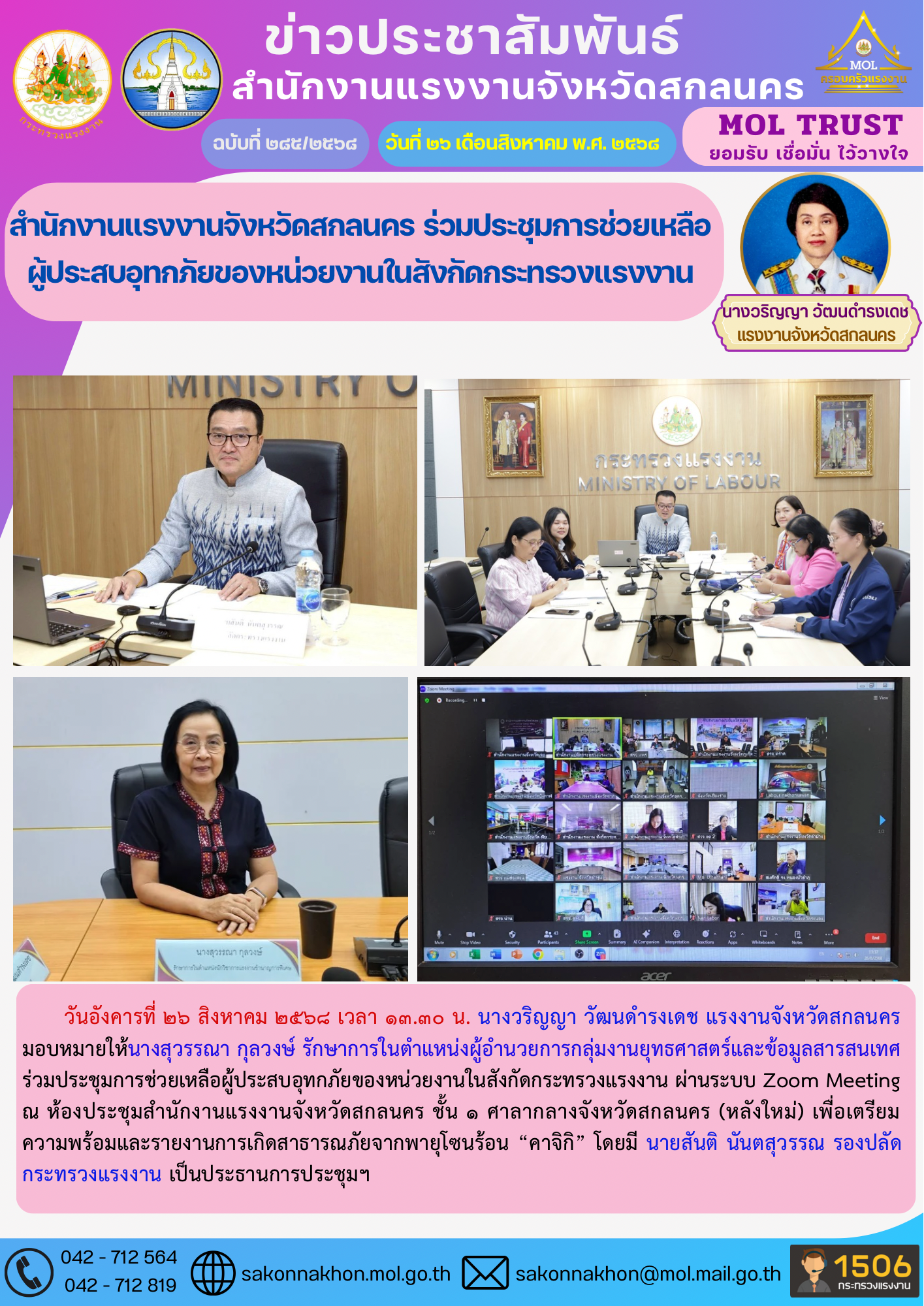 สำนักงานแรงงานจังหวัดสกลนคร ร่วมประชุมการช่วยเหลือ ผู้ประสบอุทกภัยของหน่วยงานในสังกัดกระทรวงแรงงาน