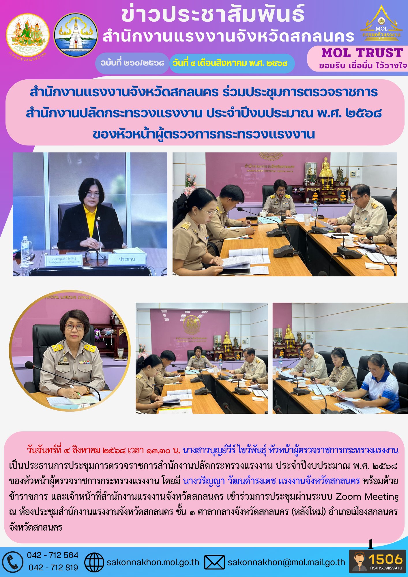 สำนักงานแรงงานจังหวัดสกลนคร ร่วมประชุมการตรวจราชการสำนักงานปลัดกระทรวงแรงงาน ประจำปีงบประมาณ พ.ศ. 2568 ของหัวหน้าผู้ตรวจการกระทรวงแรงงาน