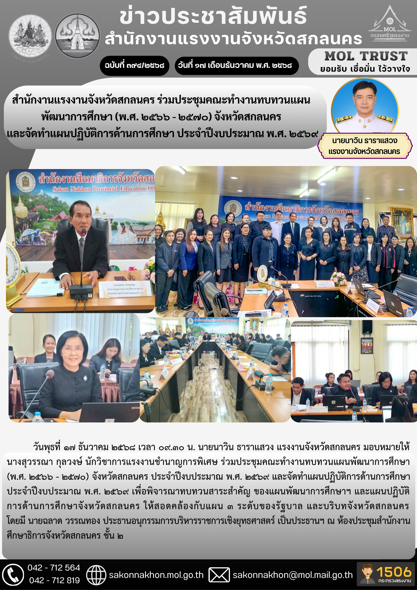 สำนักงานแรงงานจังหวัดสกลนคร ร่วมประชุมคณะทำงานทบทวนแผนพัฒนาการศึกษา (พ.ศ. 2566 – 2570) จังหวัดสกลนคร และจัดทำแผนปฏิบัติการด้านการศึกษา ประจำปีงบประมาณ พ.ศ. 2569