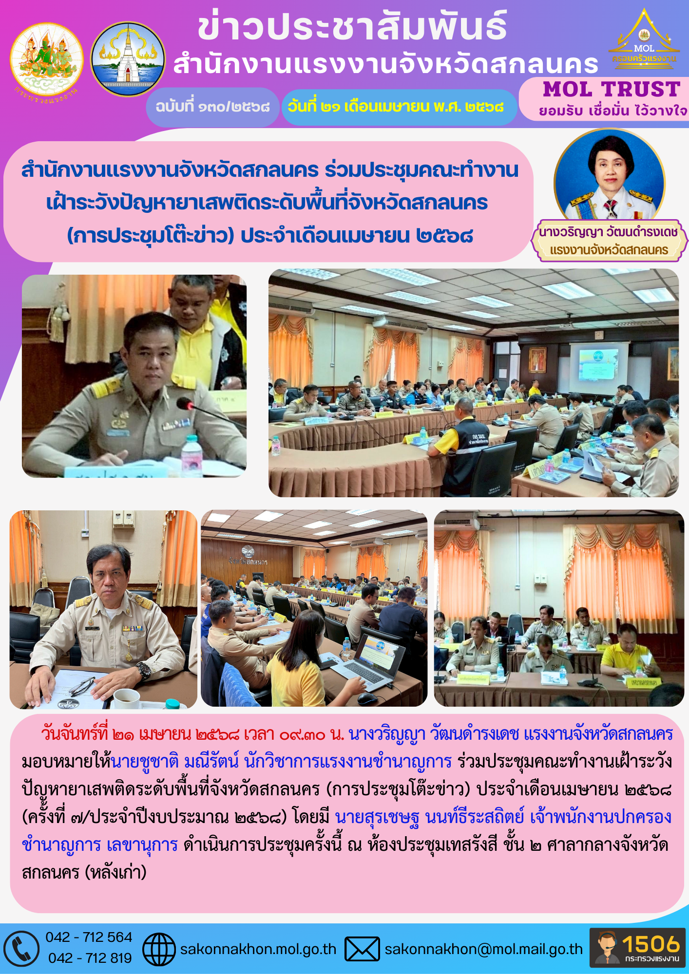 สำนักงานแรงงานจังหวัดสกลนคร ร่วมประชุมคณะทำงานเฝ้าระวังปัญหายาเสพติดระดับพื้นที่จังหวัดสกลนคร (การประชุมโต๊ะข่าว) ประจำเดือนเมษายน 2568