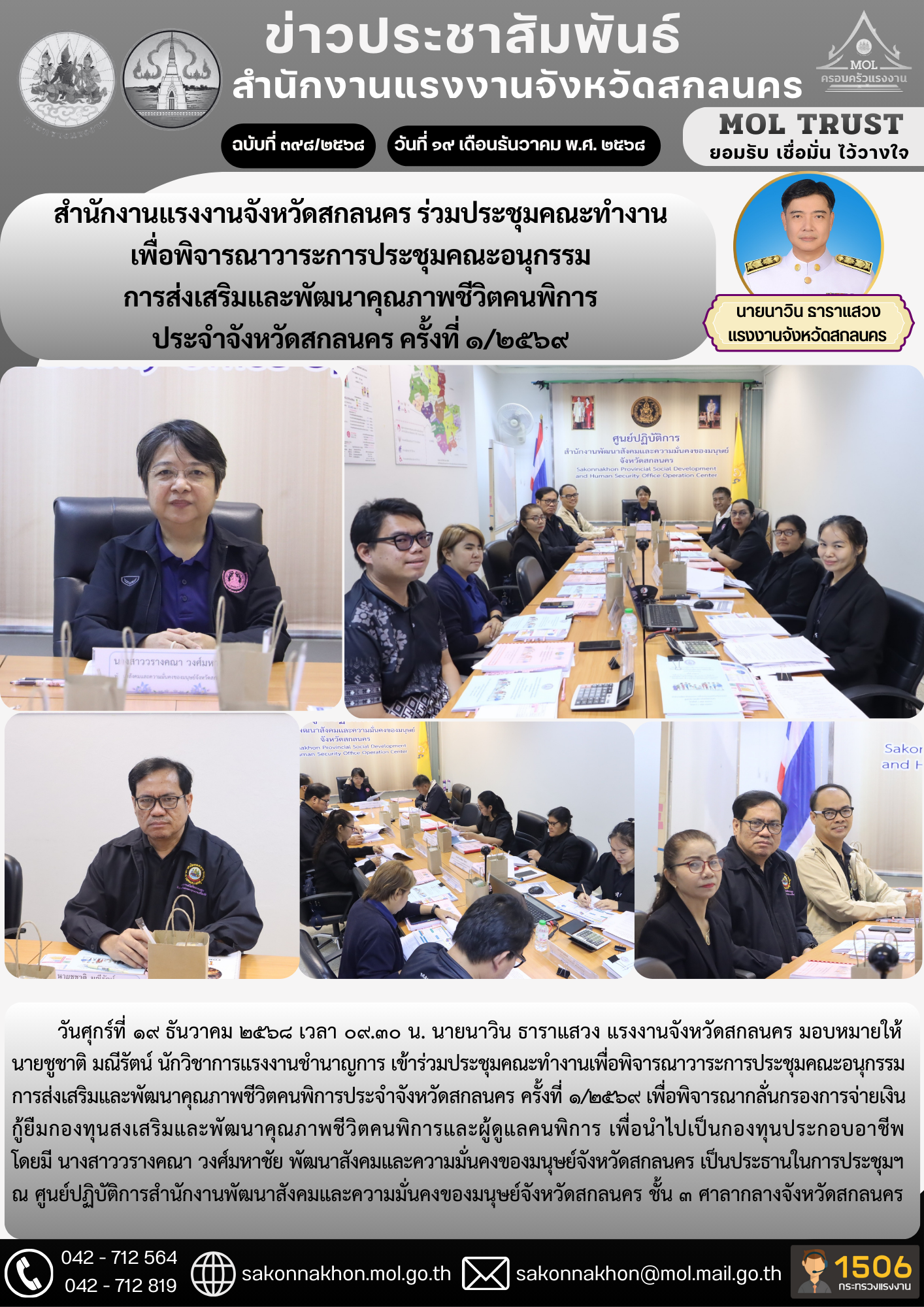สำนักงานแรงงานจังหวัดสกลนคร ร่วมประชุมคณะทำงาน เพื่อพิจารณาวาระการประชุมคณะอนุกรรม การส่งเสริมและพัฒนาคุณภาพชีวิตคนพิการ ประจำจังหวัดสกลนคร ครั้งที่ 1/2569