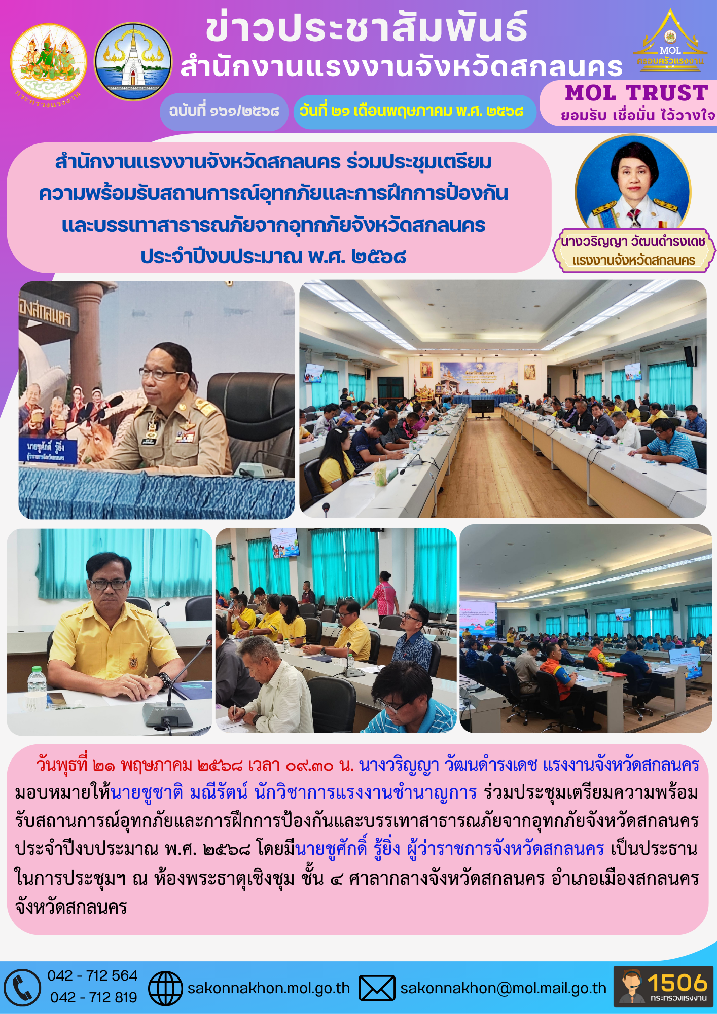 สำนักงานแรงงานจังหวัดสกลนคร ร่วมประชุมเตรียมความพร้อมรับสถานการณ์อุทกภัยและการฝึกการป้องกัน และบรรเทาสาธารณภัยจากอุทกภัยจังหวัดสกลนคร ประจำปีงบประมาณ พ.ศ. 2568
