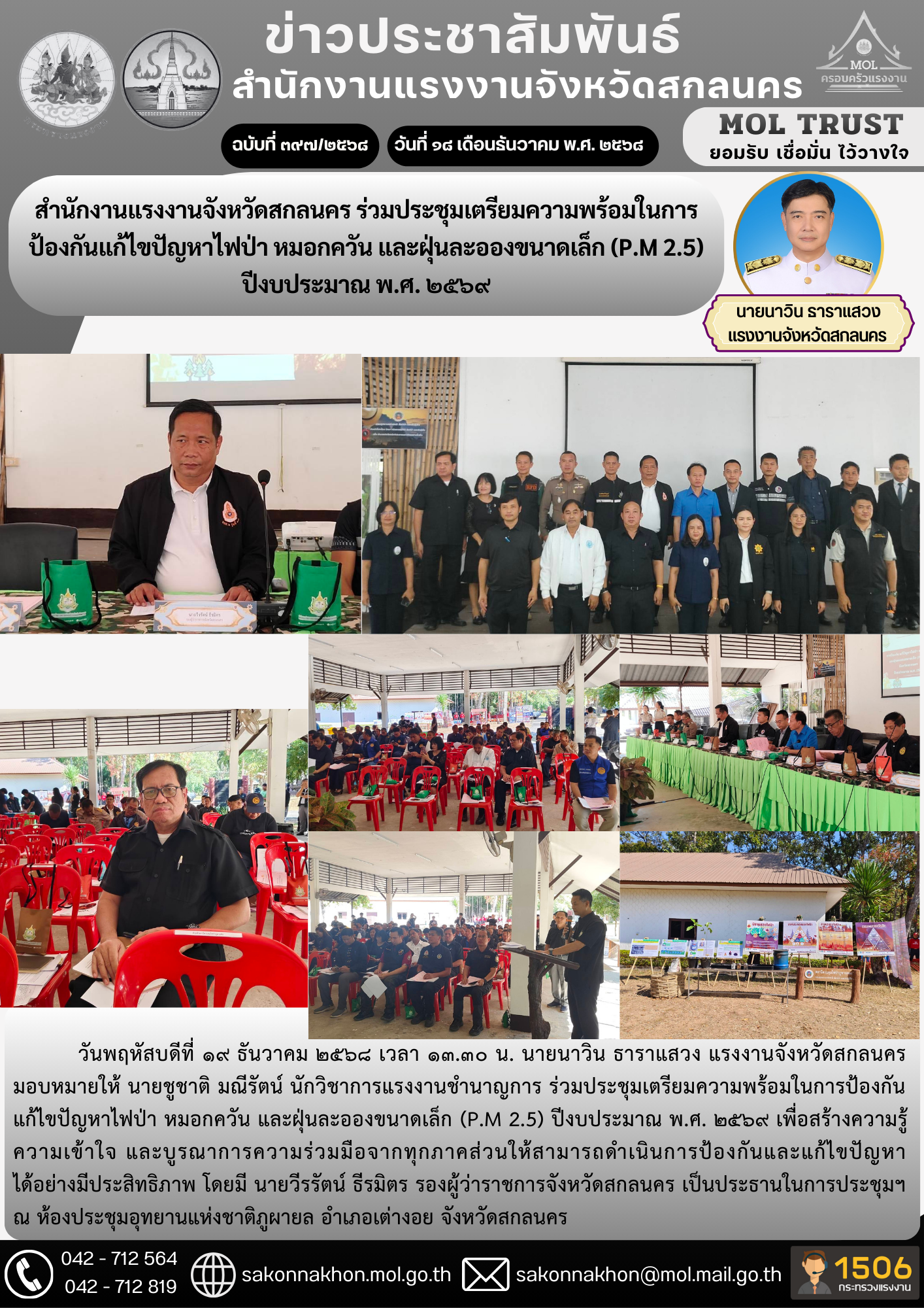 สำนักงานแรงงานจังหวัดสกลนคร ร่วมประชุมเตรียมความพร้อมในการป้องกันแก้ไขปัญหาไฟป่า หมอกควัน และฝุ่นละอองขนาดเล็ก (P.M 2.5) ปีงบประมาณ พ.ศ. 2569