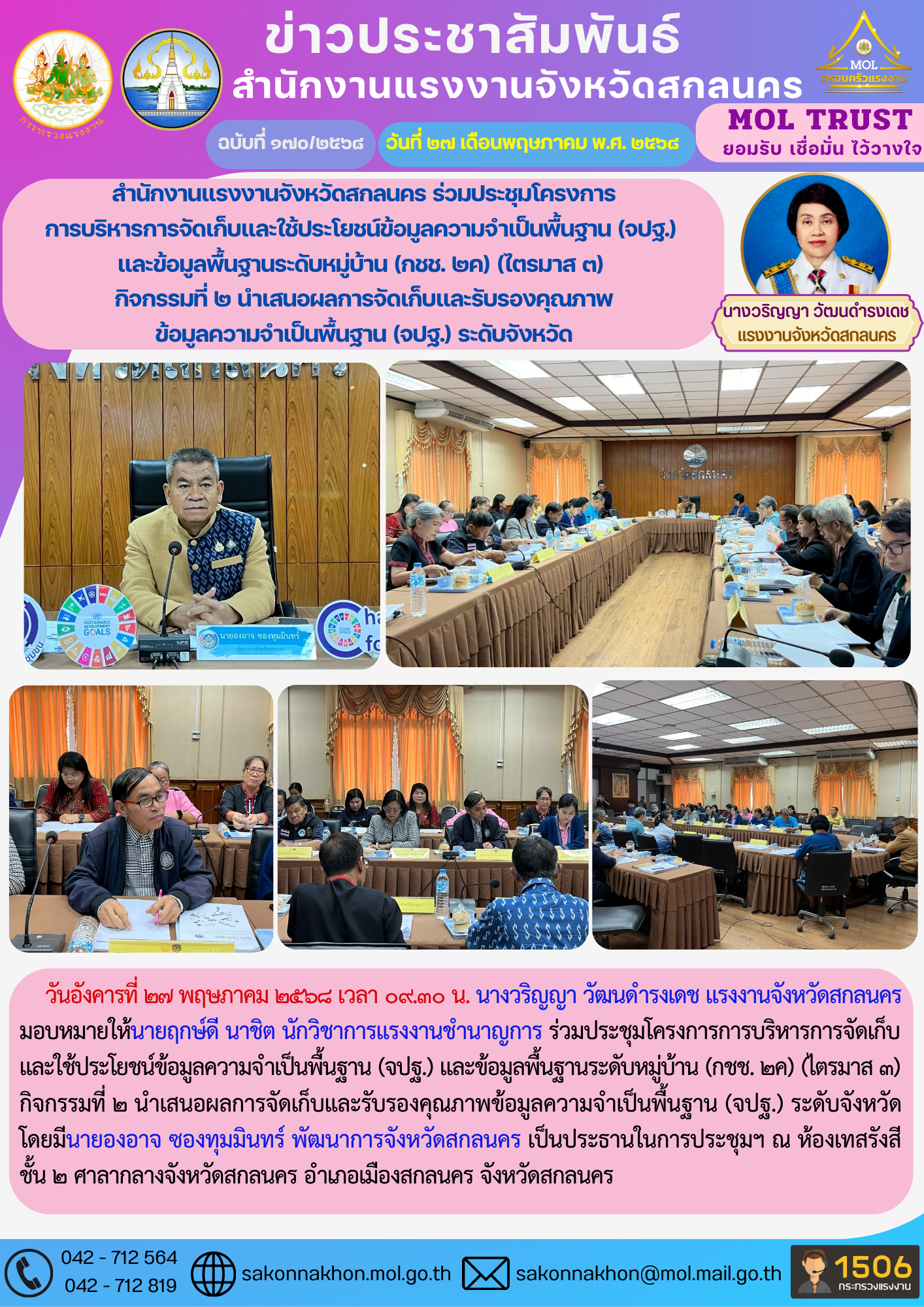สำนักงานแรงงานจังหวัดสกลนคร ร่วมประชุมโครงการ การบริหารการจัดเก็บและใช้ประโยชน์ข้อมูลความจำเป็นพื้นฐาน (จปฐ.) และข้อมูลพื้นฐานระดับหมู่บ้าน (กชช. 2ค) (ไตรมาส 3) กิจกรรมที่ 2 นำเสนอผลการจัดเก็บและรับรองคุณภาพ ข้อมูลความจำเป็นพื้นฐาน (จปฐ.) ระดับจังหวัด