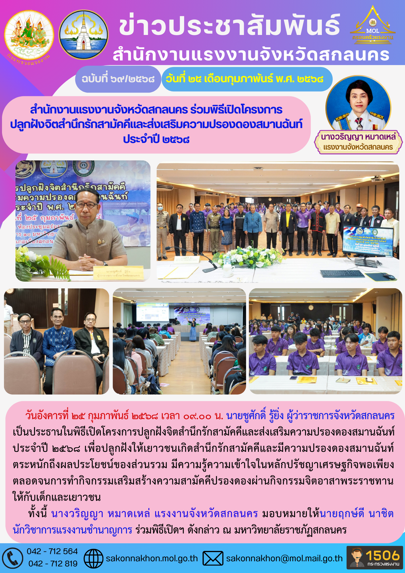 สำนักงานแรงงานจังหวัดสกลนคร ร่วมพิธีเปิดโครงการ ปลูกฝังจิตสำนึกรักสามัคคีและส่งเสริมความปรองดองสมานฉันท์ ประจำปี 2568