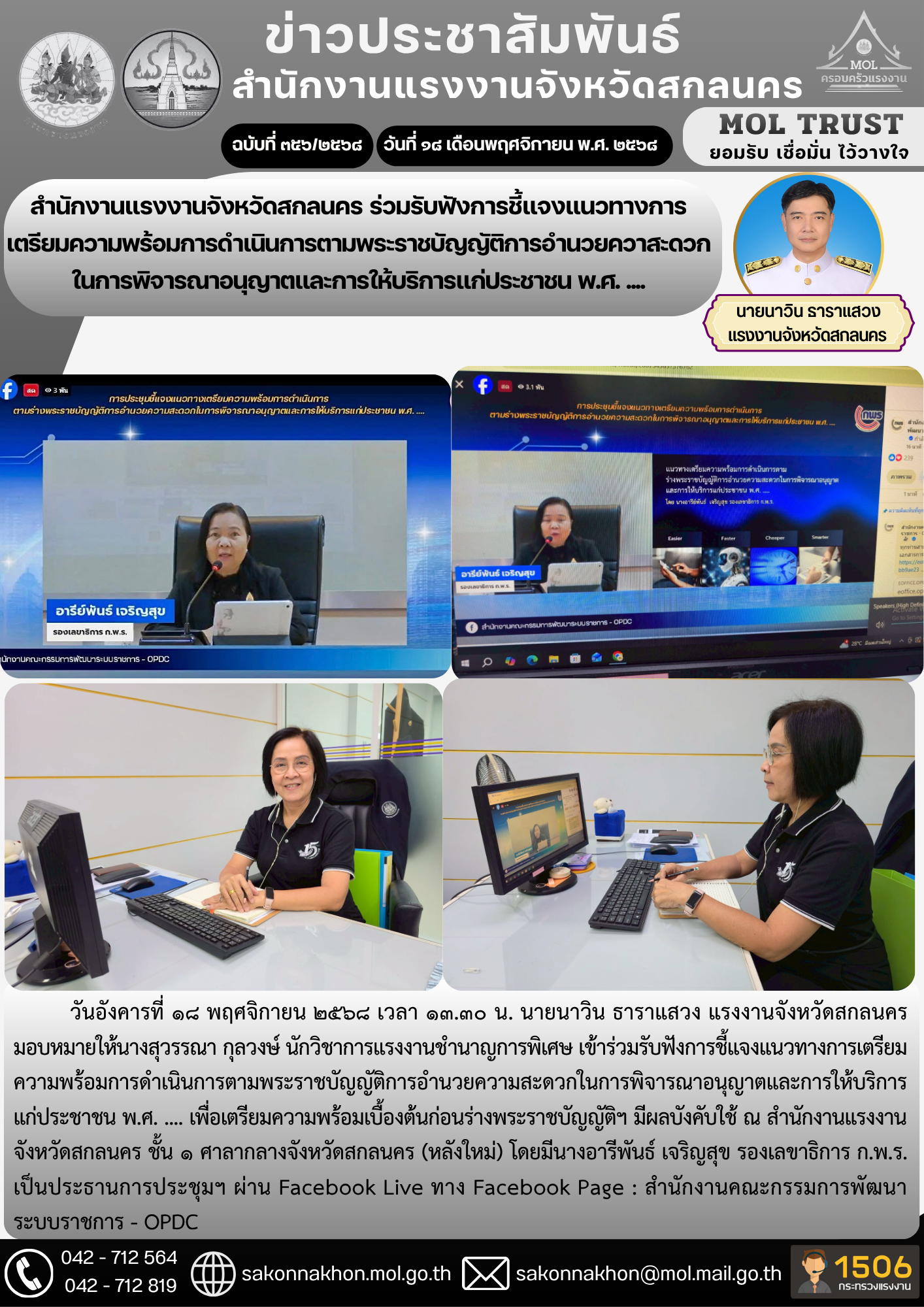 สำนักงานแรงงานจังหวัดสกลนคร ร่วมรับฟังการชี้แจงแนวทางการเตรียมความพร้อมการดำเนินการตามพระราชบัญญัติการอำนวยควาสะดวกในการพิจารณาอนุญาตและการให้บริการแก่ประชาชน พ.ศ. ….