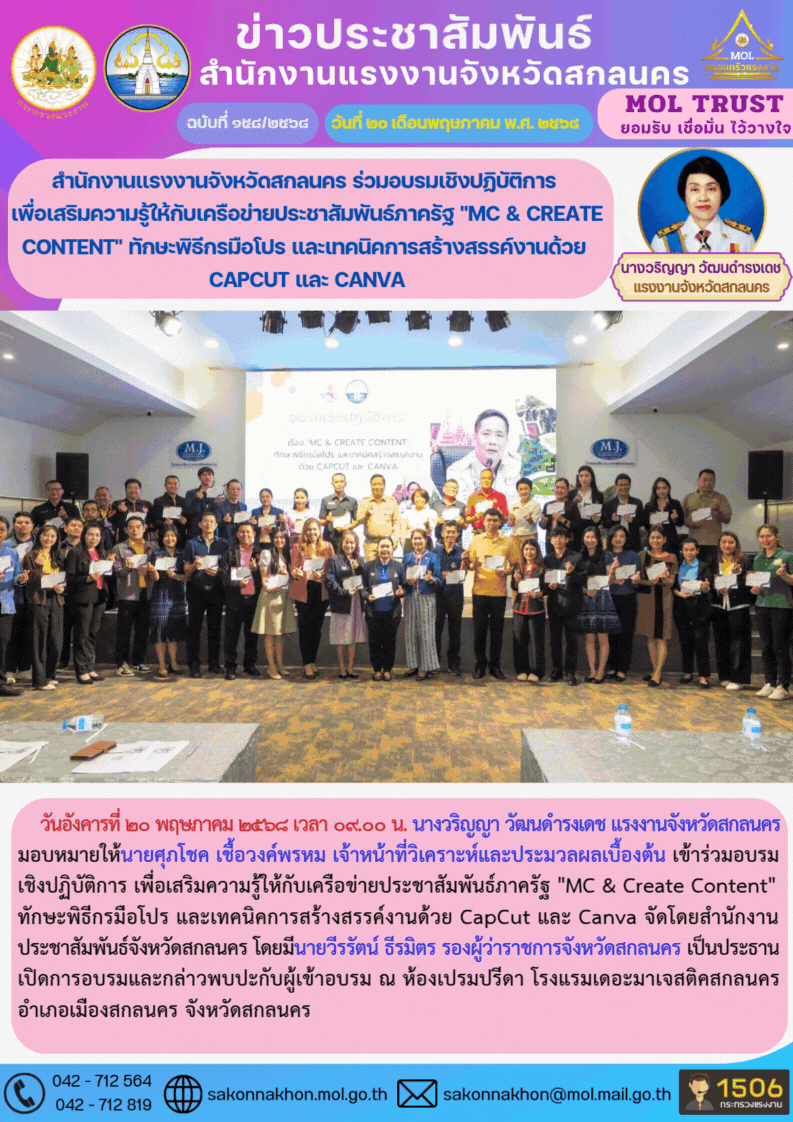 สำนักงานแรงงานจังหวัดสกลนคร ร่วมอบรมเชิงปฏิบัติการ เพื่อเสริมความรู้ให้กับเครือข่ายประชาสัมพันธ์ภาครัฐ “MC & Create Content” ทักษะพิธีกรมือโปร และเทคนิคการสร้างสรรค์งานด้วย CapCut และ Canva