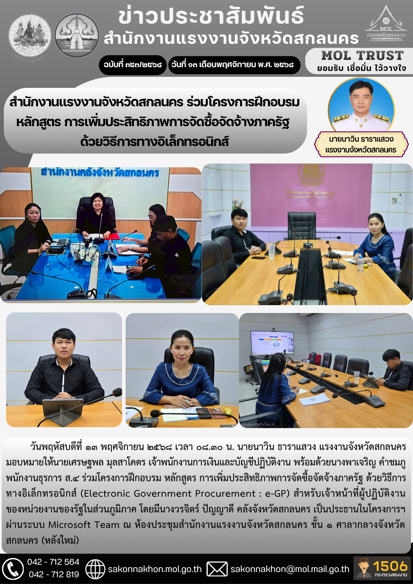 สำนักงานแรงงานจังหวัดสกลนคร ร่วมโครงการฝึกอบรม หลักสูตร การเพิ่มประสิทธิภาพการจัดซื้อจัดจ้างภาครัฐ ด้วยวิธีการทางอิเล็กทรอนิกส์