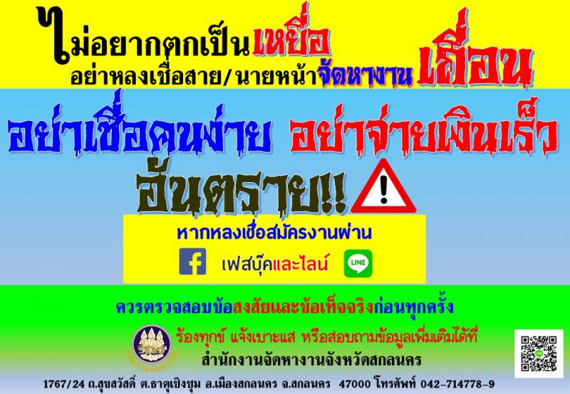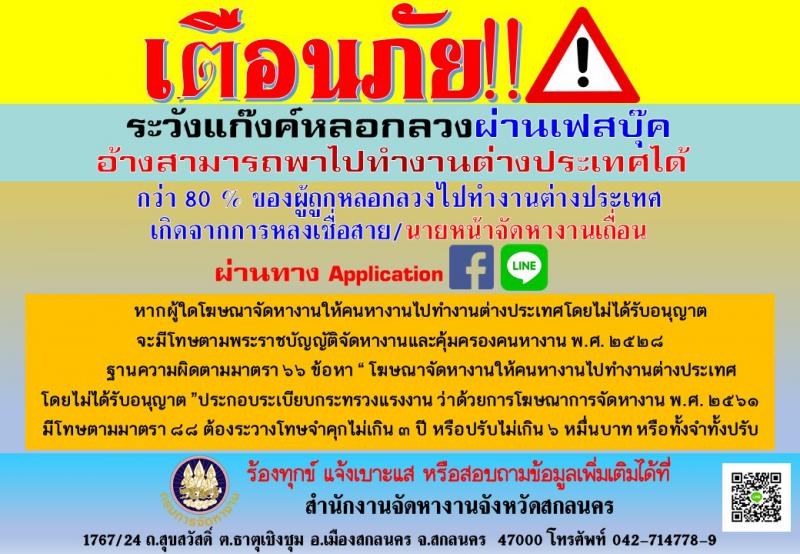 สำนักงานแรงงานจังหวัดสกลนคร แจ้งเตือนภัย !! ระวังแก๊งค์หลอกลวงผ่านเฟสบุ๊ค