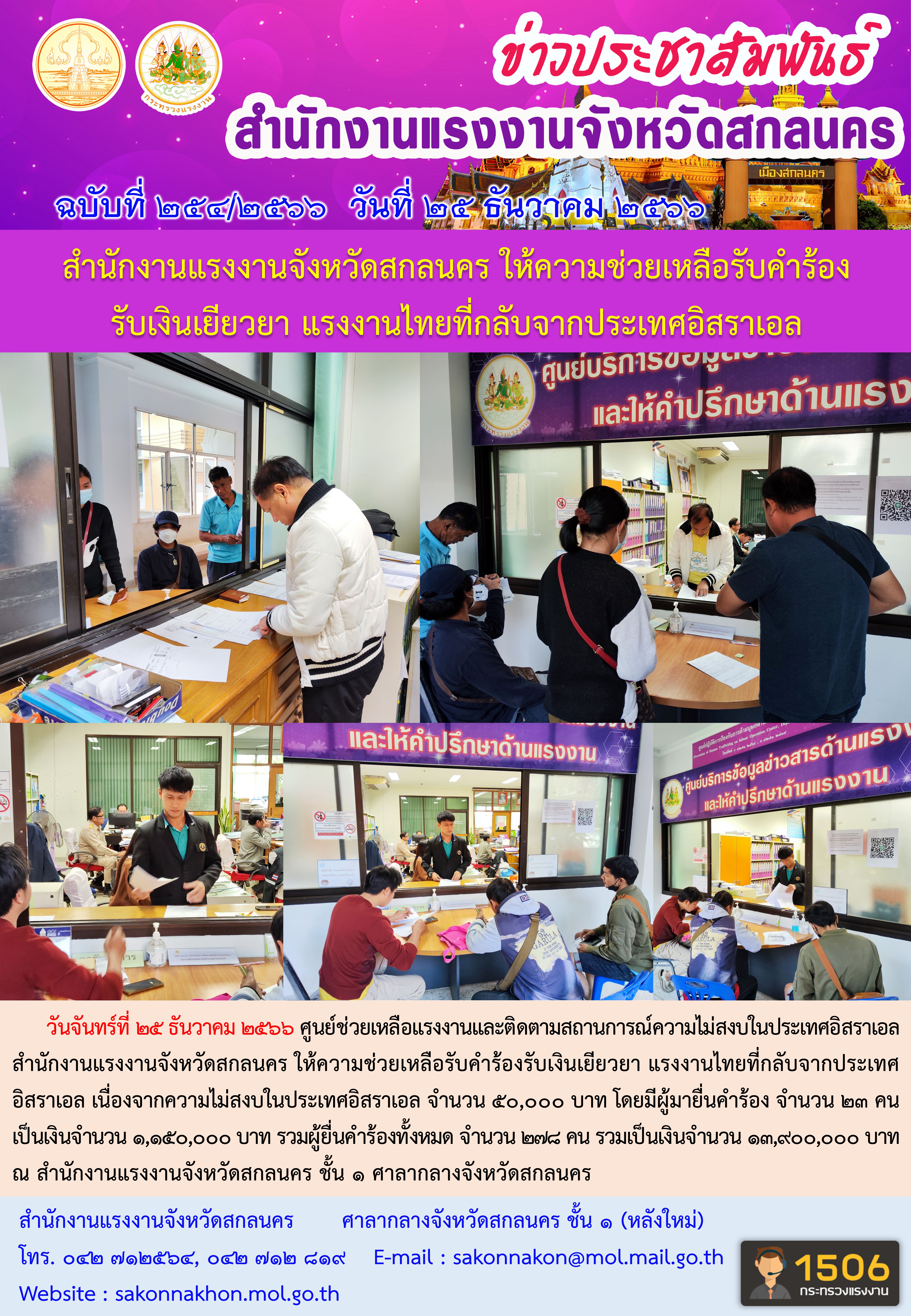 สรจ.สกลนคร ให้ความช่วยเหลือรับคำร้องรับเงินเยียวยา แรงงานไทยที่กลับจากประเทศอิสราเอล