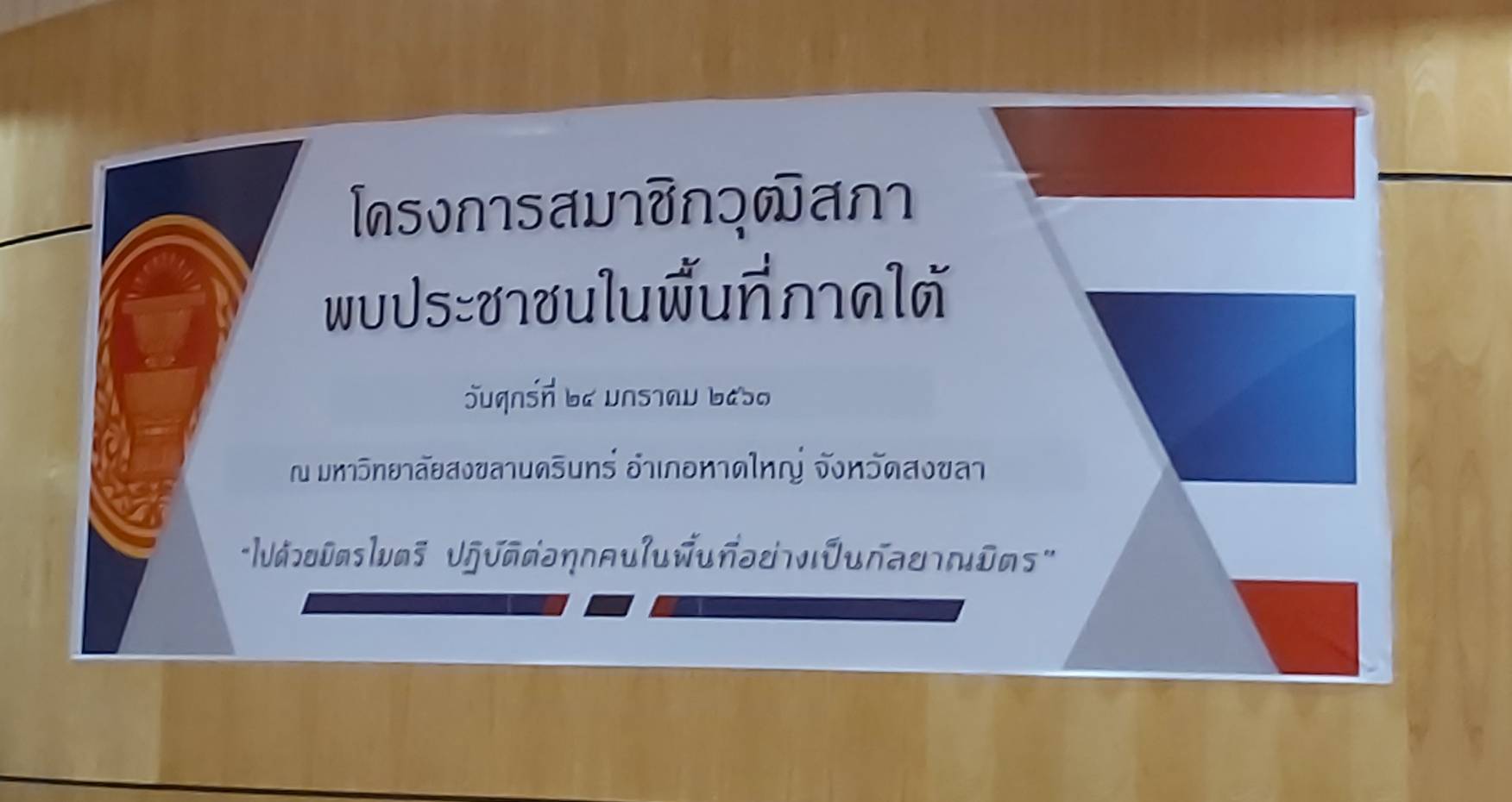 วันที่ 24 มกราคม 2563 เวลา 13.30 น. 1 เข้าร่วมโครงการสมาชิกวุฒิสภาพบประชาชนในพื้นที่จังหวัดภาคใต้ เพื่อรับฟังความคิดเห็นของประชาชนในพื้นที่ และหน่วยงานที่เกี่ยวข้อง เพื่อนำข้อมูลมาประกอบการพิจารณากลั่นกรองกฎหมายและผลสัมฤทธิ์ของกฎหมายที่ประกาศใช้บังคับ โดยมีหัวหน้าส่วนราชการ และผู้แทนหัวหน้าส่วนราชการในสังกัดกระทรวงแรงงานจังหวัดสงขลา เข้าร่วมรับฟังตามโครงการฯ ณ คณะวิทยาการจัดการ มหาวิทยาลัยสงขลานครินทร์ วิทยาเขตหาดใหญ่ อำเภอหาดใหญ่ จังหวัดสงขลา