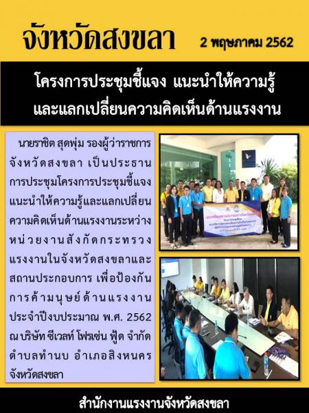 สำนักงานแรงงานจังหวัดสงขลา เปิดโครงการประชุมชี้แจง แนะนำให้ความรู้ และแลกเปลี่ยนความคิดเห็นด้านแรงงาน ณ บริษัท ซีเวลท์ โฟรเซ่น ฟู้ด จำกัด
