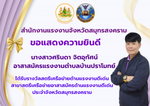 สำนักงานแรงงานจังหวัดสมุทรสงคราม ขอแสดงความยินดีกับนางสาวศรินดา จิตอุทัศน์ อาสาสมัครแรงงานตำบลบ้านปราโมทย์ ได้รับรางวัลสตรีเครือข่ายด้านแรงงานดีเด่น สาขาสตรีเครือข่ายอาสาสมัครด้านแรงงานดีเด่น ประจำจังหวัดสมุทรสงคราม