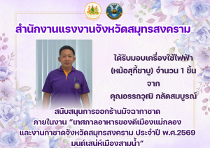 สำนักงานแรงงานจังหวัดสมุทรสงคราม ได้รับมอบเครื่องใช้ไฟฟ้า (หม้อสุกี้ชาบู) จำนวน 1 ชิ้น จาก คุณอรรถวุฒิ กลัดสมบูรณ์ สนับสนุนการออกร้านมัจฉากาชาด ภายในงาน ”เทศกาลอาหารของดีเมืองแม่กลอง และงานกาชาดจังหวัดสมุทรสงคราม ประจำปี พ.ศ.2569 มนต์เสน่ห์เมืองสามน้ำ”