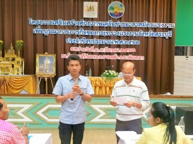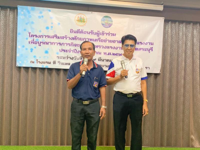 วันที่ 8 – 9 มีนาคม 2562 เวลา 07.30 น. สำนักงานแรงงานจังหวัดสระบุรีจัดโครงการเสริมสร้างศักยภาพเครือข่ายอาสาสมัครแรงงานเพื่อบูรณาการภารกิจของกระทรวงแรงงานจังหวัดสระบุรี ประจำปีงบประมาณ พ.ศ.2562 ณ โรงแรม ที วินเทจ บางคล้า และศูนย์ศึกษาการพัฒนาเขาหินซ้อนอันเนื่องมาจากพระราชดำริ จังหวัดฉะเชิงเทรา โดยมีกิจกรรมบรรยายหัวข้อ การป้องกันปัญหายาเสพติดในสถานประกอบการที่มีลูกจ้างต่ำกว่า 10 คนลงมา ทิศทางของกระทรวงแรงงานและเทคนิคการบูรณาการประสานงานเพื่อเพิ่มประสิทธิภาพการให้บริการ รวมถึงมีกิจกรร ศึกษาดูงานศูนย์ศึกษาการพัฒนาเขาหินซ้อนอันเนื่องมาจากพระราชดำริ เพื่อนำไปปรับใช้ในการทำงานในพื้นที่ชุมชน ซึ่งมีนางสาวรัตนา ทองกลับ แรงงานจังหวัดสระบุรี เป็นประธาน และผู้แทนหน่วยงานสังกัดกระทรวงแรงงานจังหวัดสระบุรี ได้เข้าร่วมกิจกรรมดังกล่าวด้วย โดยมีเจ้าหน้าที่สำนักงานแรงงานจังหวัดฉะเชิงเทรา ประธานชมรมอาสาสมัครแรงงาน และเครือข่ายอาสาสมัครแรงงานงานจังหวัดฉะเชิงเทรา ให้การต้อนรับด้วย