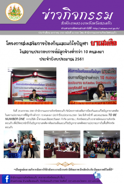 วันที่ 25 มกราคม 2561 สำนักงานแรงงานจังหวัดสระแก้ว จัดโครงการส่งเสริมการป้องกันและแก้ไขปัญหายาเสพติด ในสถานประกอบการที่มีลูกจ้างต่ำกว่า 10 คนลงมา ประจำปีงบประมาณ 2561 โดย มีเจ้าหน้าที่ และคณะชมรม TO BE NUMBER ONE จากบริษัท น้ำตาลและอ้อยตะวันออก จำกัด (มหาชน) จังหวัดสระแก้ว