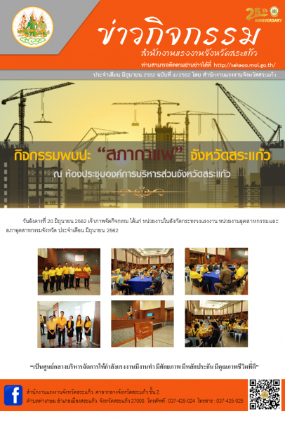สำนักงานแรงงานจังหวัดสระแก้ว ร่วมเป็นเจ้าภาพจัดกิจกรรม ได้แก่ หน่วยงานในสังกัดกระทรวงแรงงาน หน่วยงานอุตสาหกรรมและสภาอุตสาหกรรมจังหวัด ประจำเดือน มิถุนายน 2562