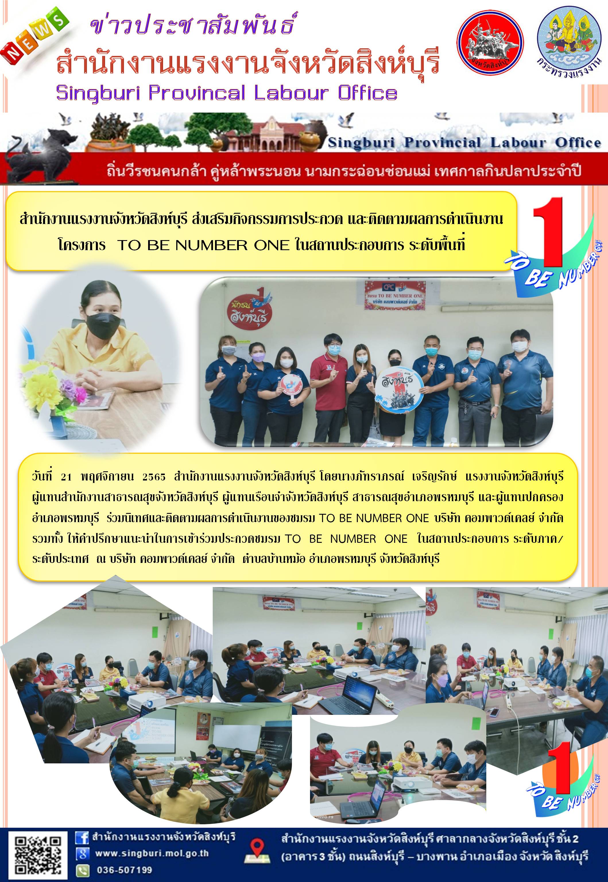 สำนักงานแรงงานจังหวัดสิงห์บุรี ส่งเสริมการประกวดและติดตามผลการดำเนินงาน โครงการ to be number one ในสถานประกอบการระดับพื้นที่