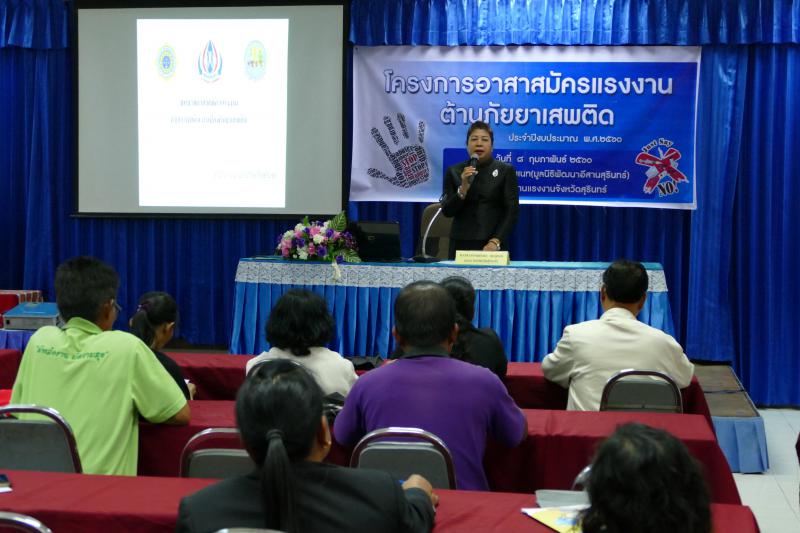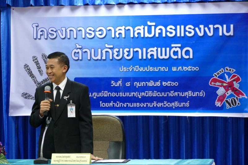 วันที่ 8 กุมภาพันธ์ 2560 สำนักงานแรงงานจังหวัดสุรินทร์ จัดโครงการอาสาสมัครแรงงานต้านภัยยาเสพติด ประจำปีงบประมาณ 2560 ณ มูลนิธิพัฒนาอีสาน (ศูนย์เนท) ถนนสุรินทร์ – สังขะ อำเภอเมือง จังหวัดสุรินทร์ โดยมี นายเลิศบุศย์ กองทอง รองผู้ว่าราชการจังหวัดสุรินทร์ เป็นประธาน