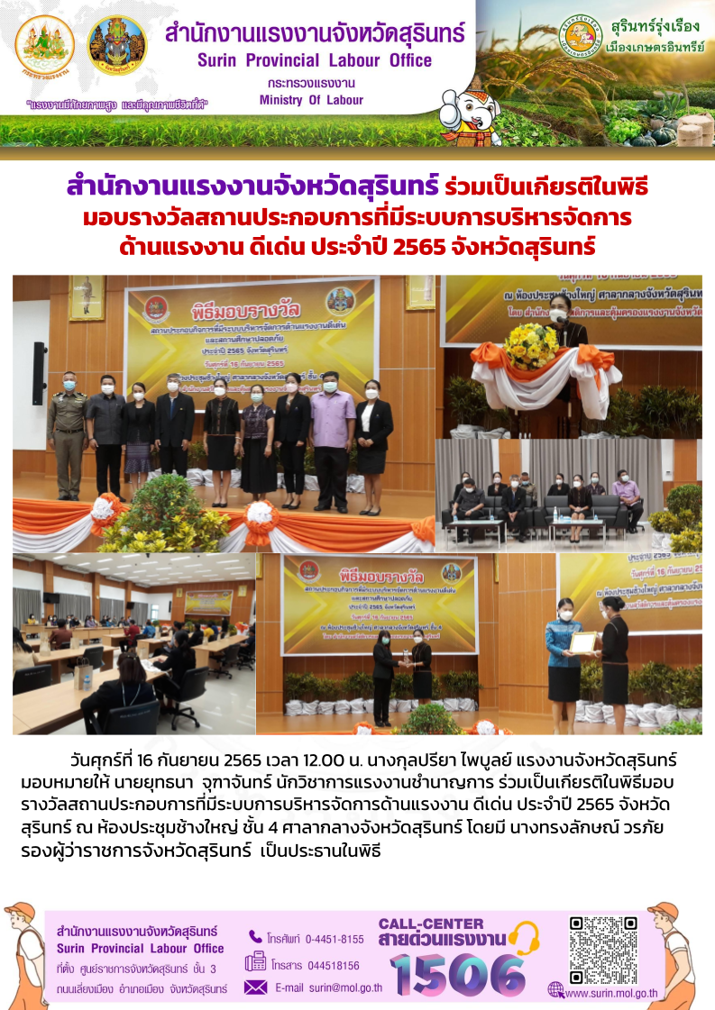 สำนักงานแรงงานจังหวัดสุรินทร์ ร่วมเป็นเกียรติในพิธีมอบรางวัลสถานประกอบการที่มีระบบการบริหารจัดการด้านแรงงานดีเด่น ประจำปี 2565 จังหวัดสุรินทร์
