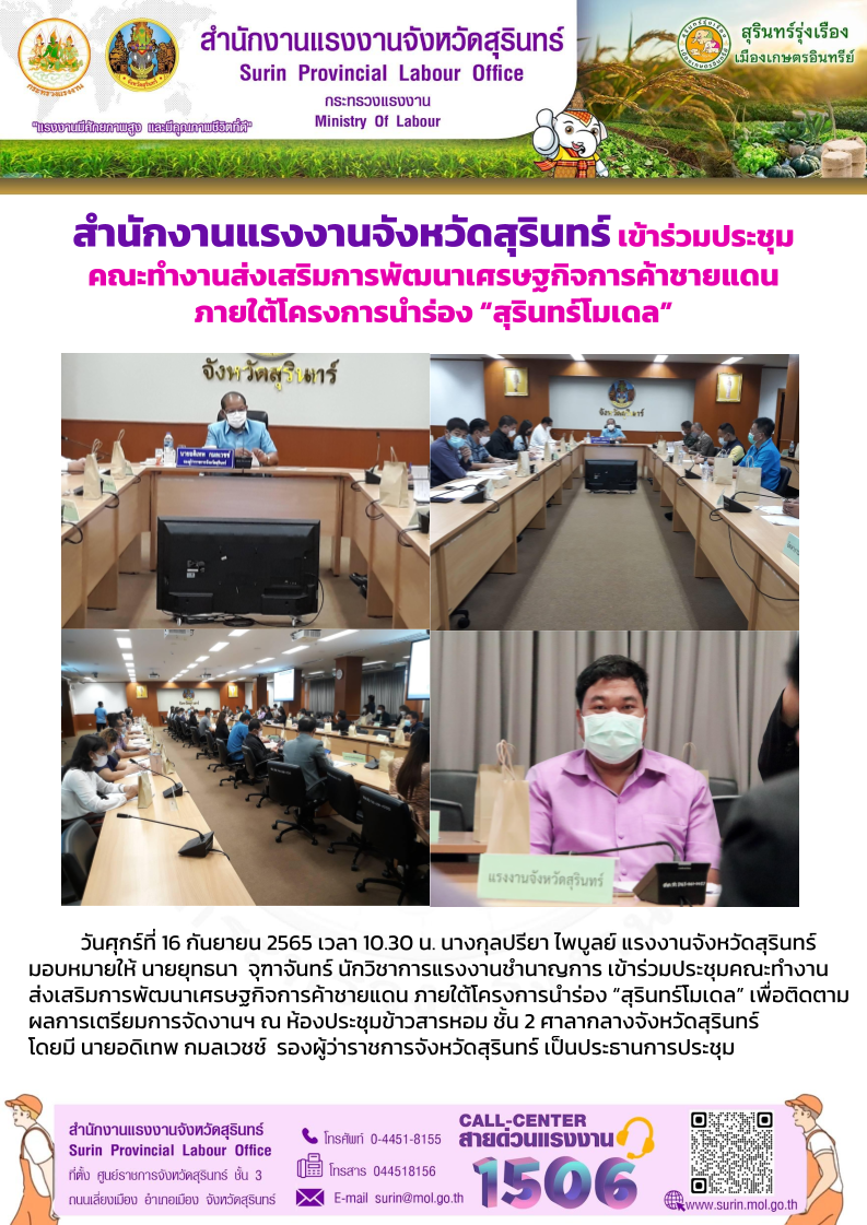 สำนักงานแรงงานจังหวัดสุรินทร์ เข้าร่วมประชุมคณะทำงานส่งเสริมการพัฒนาเศรษฐกิจการค้าชายแดน ภายใต้โครงการนำร่อง “สุรินทร์โมเดล”