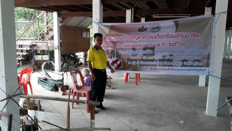 วันที่ 10 กรกฎาคม 2561 นางอรวรรณ หินตะ แรงงานจังหวัดสุรินทร์ มอบหมายให้นายยุทธนา จุฑาจันทร์ นักวิชาการแรงงานชำนาญการ เปิดฝึกทักษะฝีมืออาชีพโครงการแก้ไขปัญหาความเดือดร้อนด้านอาชีพ ประจำปีงบประมาณ พ.ศ. 2561 กิจกรรมพัฒนาทักษะฝีมือ หลักสูตรการย้อมไหมด้วยสีธรรมชาติ ระหว่างวันที่ 10-12 กรกฎาคม 2561 ณ หมู่ที่ 4 ตำบลหนองบัวบาน อำเภอรัตนบุรี จังหวัดสุรินทร์
