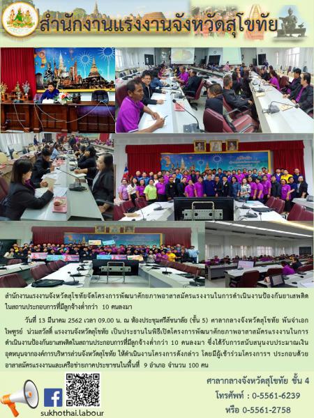 สำนักงานแรงงานจังหวัดสุโขทัยจัดโครงการพัฒนาศักยภาพอาสาสมัครแรงงานในการดำเนินงานป้องกันยาเสพติดในสถานประกอบการที่มีลูกจ้างต่ำกว่า 10 คนลงมา