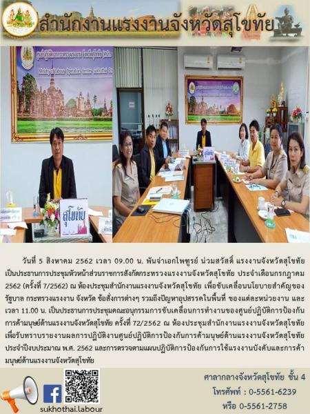 สำนักงานแรงงานจังหวัดสุโขทัย จัดประชุมหัวหน้าส่วนราชการสังกัดกระทรวงแรงงานจังหวัดสุโขทัย ประจำเดือนกรกฎาคม 2562 (ครั้งที่ 7/2562)