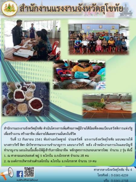สำนักงานแรงงานจังหวัดสุโขทัย ดำเนินโครงการเพิ่มศักยภาพผู้มีรายได้น้อยที่ลงทะเบียนสวัสดิการแห่งรัฐเพื่อสร้างงาน สร้างอาชีพ เพิ่มรายได้และความมั่นคงในชีวิต