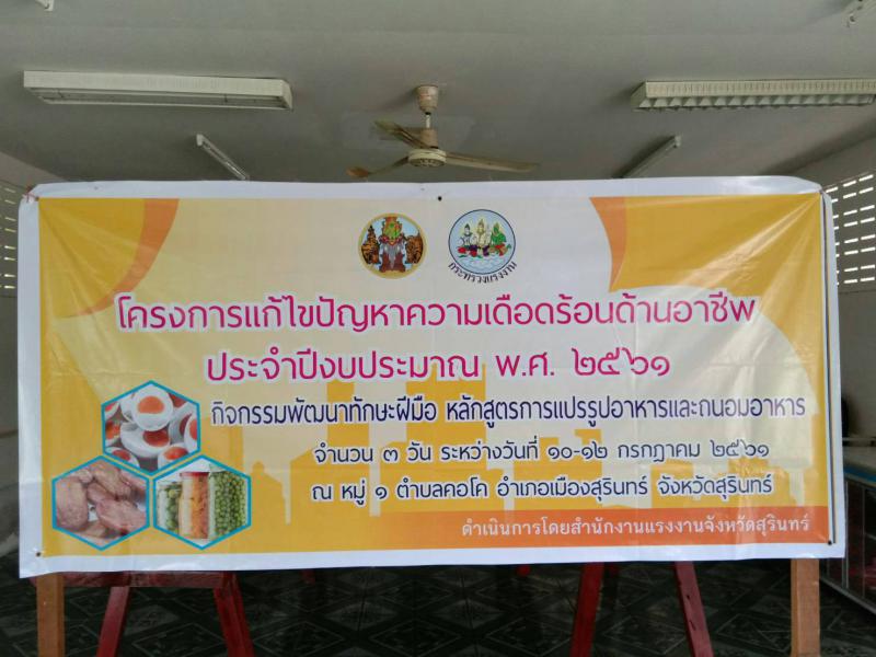 วันที่ ๑๒ กรกฎาคม ๒๕๖๑ นางอรวรรณ หินตะ แรงงานจังหวัดสุรินทร์ มอบหมายให้ นางวัลภา ปริยานุรักษ์ พนักงานธุรการ ส.๓ ปิดฝึกทักษะฝีมืออาชีพโครงการแก้ไขปัญหาความเดือดร้อนด้านอาชีพ ประจำปีงบประมาณ พ.ศ. ๒๕๖๑ กิจกรรมพัฒนาทักษะฝีมือ หลักสูตรการแปรรูปอาหารและการถนอมอาหาร ระหว่างวันที่ ๑๐-๑๒ กรกฎาคม ๒๕๖๑ ณ หมู่ที่ ๑ ตำบลคอโค อำเภอเมือง จังหวัดสุรินทร์