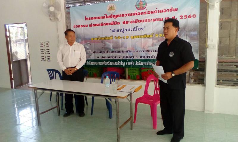 ในวันที่ 10 กุมภาพันธ์ 2560 สำนักงานแรงงานจังหวัดหนองบัวลำภู ได้ดำเนินการเปิดโครงการแก้ไขปัญหาความเดือดร้อนด้านอาชีพ ปีงบประมาณ 2560 สาขาช่างปูกระเบื้อง รุ่นที่ 1 โดย มี นายกองค์การบริหารส่วนตำบลนิคมพัฒนา เป็นประธานในการเปิดโครงการนี้ ณ ตำบลนิคมพัฒนา อำเภอโนนสัง จังหวัดหนงอบัวลำภู ซึ่งมีระยะเวลาฝึกระหว่างวันที่ 10 – 19 กุมภาพันธ์ 2560