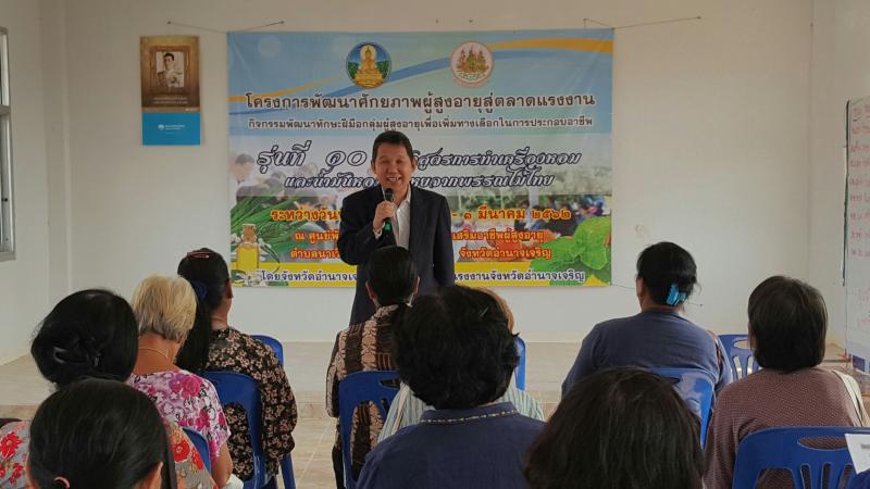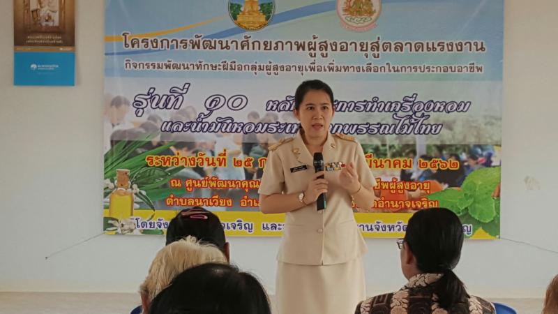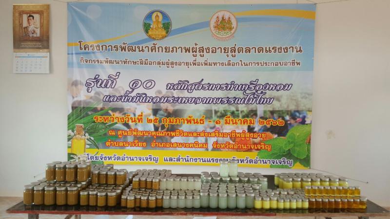 สำนักงานแรงงานจังหวัดอำนาจเจริญ เปิดโครงการพัฒนาศักยภาพผู้สูงอายุสู่ตลาดแรงงาน กิจกรรมพัฒนาทักษะฝีมือกลุ่มผู้สูงอายุเพื่อเพิ่มทางเลือกในการประกอบอาชีพ หลักสูตร 30 ชั่วโมง ( 5 วัน) ประจำปีงบประมาณ พ.ศ. 2562 รุ่นที่ 10 หลักสูตรการทำเครื่องหอมและน้ำมันหอมระเหยจกพรรณไม้ไทย ระหว่างวันที่ 25 – 1 มีนาคม 2562 ณ ศูนย์พัฒนาคุณภาพชีวิตและส่งเสริมอาชีพผู้สูงอายุ (ศพอศ.) อบต.นาเวียง อ.เสนางคนิคม จังหวัดอำนาจเจริญ