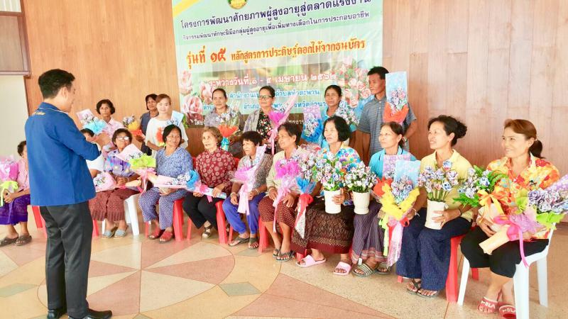 โครงการพัฒนาศักยภาพผู้สูงอายุสู่ตลาดแรงงาน รุ่นที่ 15 หลักสูตรการประดิษฐ์ดอกไม้จากธนบัตร เมื่อวันที่ 1 เมษายน 2562 สำนักงานแรงงานจังหวัดอำนาจเจริญ เปิดโครงการพัฒนาศักยภาพผู้สูงอายุสู่ตลาดแรงงาน กิจกรรมพัฒนาทักษะฝีมือกลุ่มผู้สูงอายุเพื่อเพิ่มทางเลือกในการประกอบอาชีพ หลักสูตร 30 ชั่วโมง ( 5 วัน) ประจำปีงบประมาณ พ.ศ. 2562 รุ่นที่ 13 หลักสูตรการประดิษฐ์ดอกไม้จากธนบัตร ระหว่างวันที่ 1 – 5 เมษายน 2562 ณ เทศบาลตำบลหัวตะพาน อำเภอหัวตะพาน จังหวัดอำนาจเจริญ