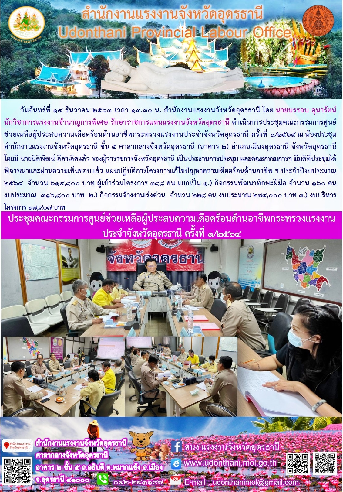 สำนักงานแรงงานจังหวัดอุดรธานี ประชุมคณะกรรมการศูนย์ช่วยเหลือผู้ประสบความเดือดร้อนด้านอาชีพกระทรวงแรงงาน ประจําจังหวัดอุดรธานี ครั้งที่ ๑/๒๕๖๔